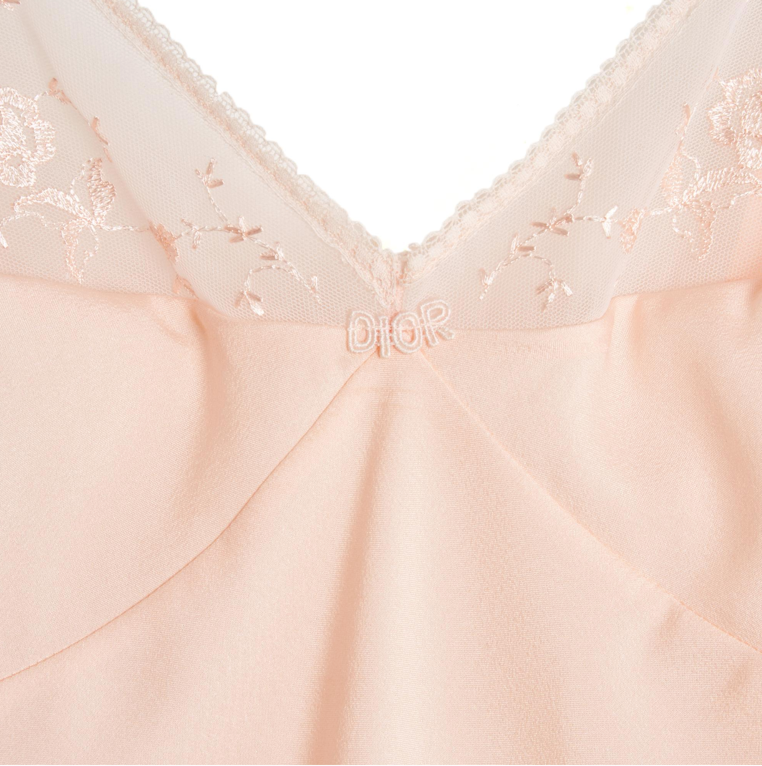 An exquisite archival piece from Dior Lingerie, circa 1985. Originally designed as a robe-combinaison, this pink satin slip dress now charms as a wearable treasure. Made from fluid polyester crepe, it features delicate straps, a V-neckline adorned with Dior-branded floral lace, and a soft left-side slit for ease and elegance. The hem is finished with miniature crochet-style embroidery for an extra romantic touch.
