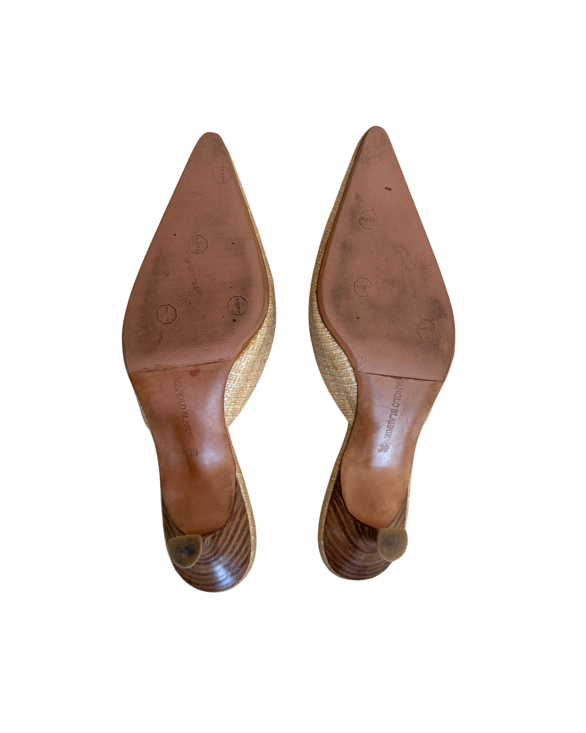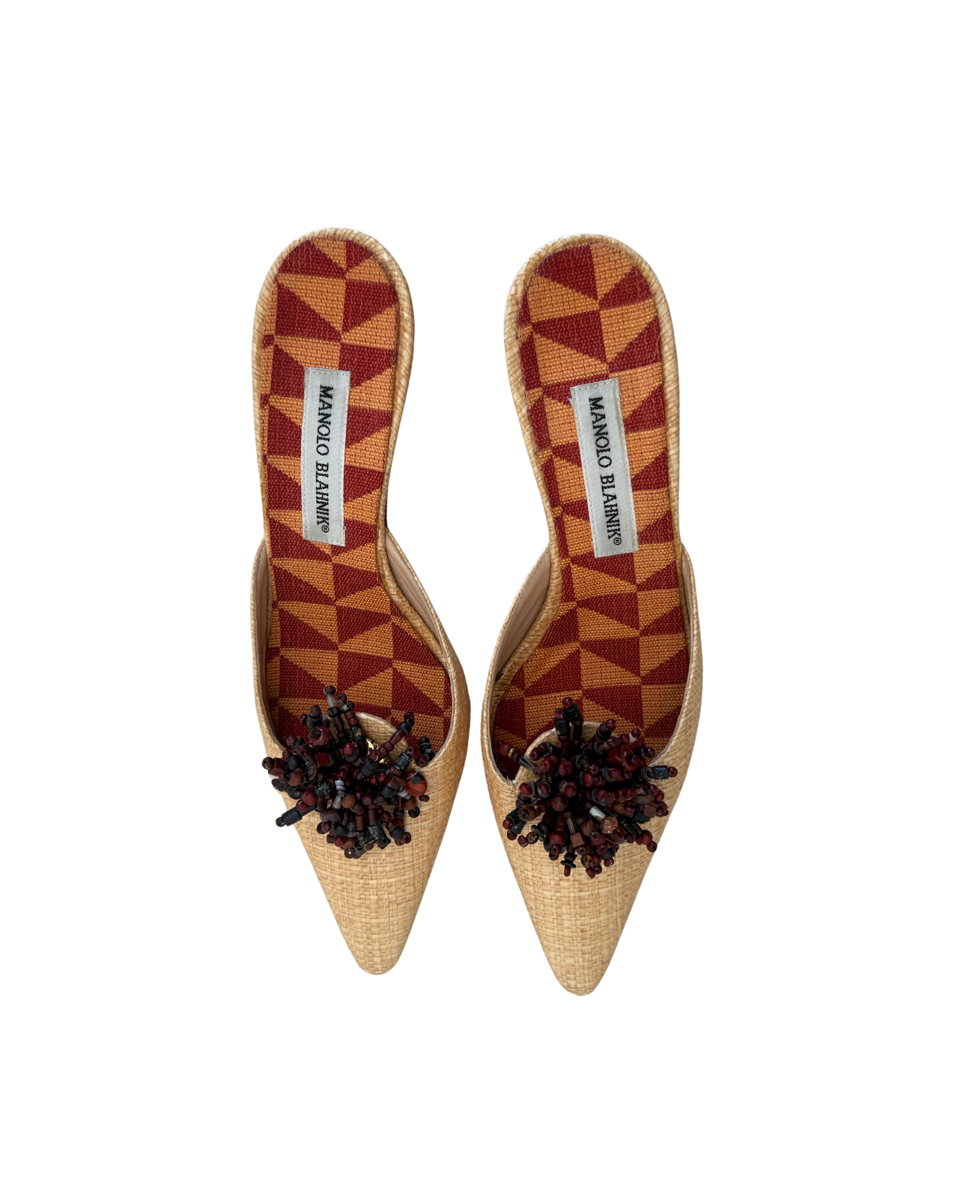 A sculptural statement piece from Manolo Blahnik, these raffia mules marry artisanal texture with architectural elegance. Featuring a pointed toe, geometric red-and-orange jacquard insole, and dramatic beaded floral embellishments in rich shades of garnet and espresso, they’re a masterclass in warm-weather luxury.